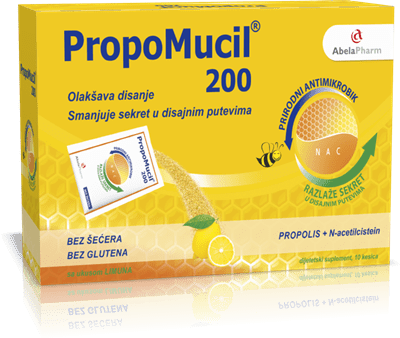 PropoMucil® kesice – prirodni antimikrobik – prečišćen, nealergen propolis sa prirodnim N-acetilcisteinom (NAC) kod osoba sa problemima disajnih puteva praćenih stvaranjem šlajma.